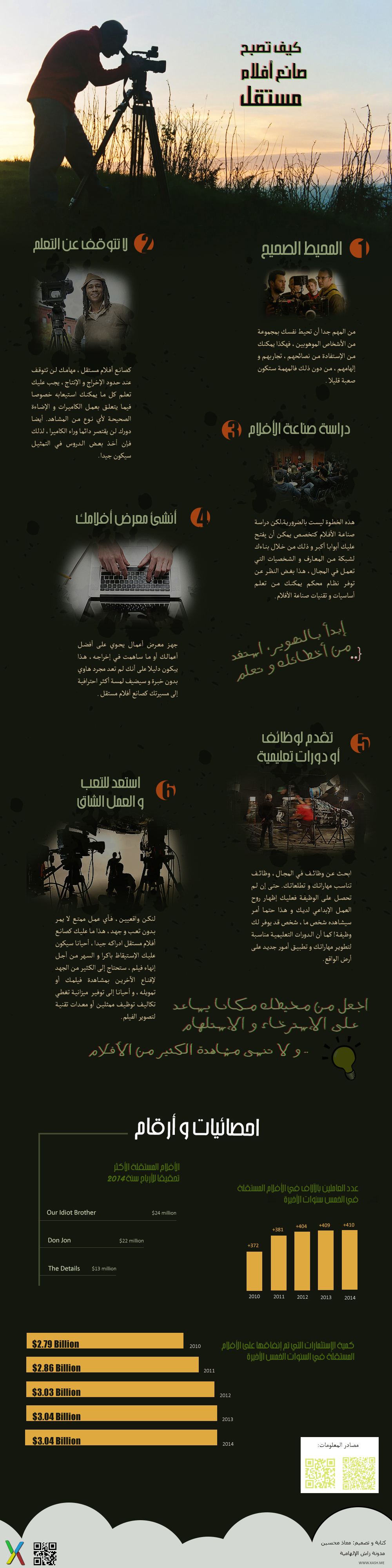 أحيانا، أفضل الأفلام يتم إخراجها من طرف شباب و صانعي أفلام مستقلين. إنها لتجربة ممتعة أن تخوض غمار مهنة صانع أفلام مستقل، و لكي تصبح واحدا من هؤلاء المبدعين العباقرة فقد أعددنا لك رسما تعليميا يساعدك لتضع النقاط على الحروف من أجل بدء هذه المهنة سواء من أجل المتعة أو كمصدر دخل مادي، بالإضافة إلى أرقام تدل على مدى تزايد الإهتمام بهذه الصناعة التي أصبحت تساوي المليارات.